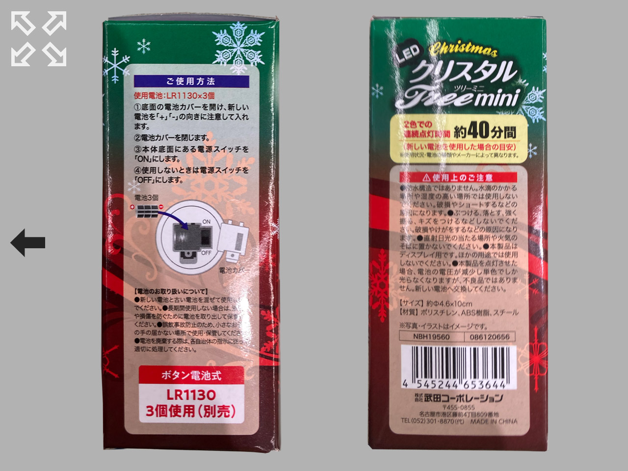 セリア(〜2025) アクリル樹脂製のミニクリスマスツリー。 赤と緑の2色に光る。 ボタン電池LR1130×3個付き。連続点灯時間約40分 サイズ:Φ4.6cm×10cm 発売元:株式会社 武田コーポレーション (中国製)