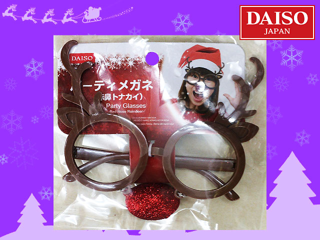 ■ダイソー(2017~) 仮装用のフレームメガネ。 メガネ本体から、「ひげ」や「鼻」が吊るされている。 パッケージの女性の表情が秀逸。 左から ・つるひげサンタ ・しまひげサンタ ・赤鼻トナカイ