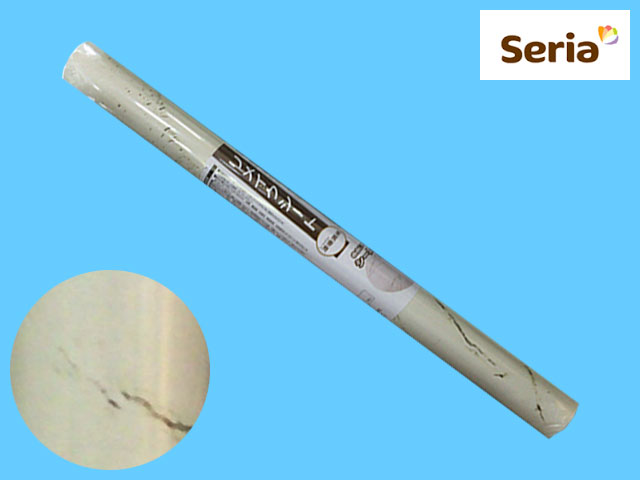 ■セリア 粘着シールタイプのシート。 家具や冷蔵庫、壁面などに貼り付けて手軽に模様がえができる。 もちろん汚れ隠しや汚れ防止にも良い。 防水加工ではないが、軽い水拭き程度なら問題ない。 約45×90cm 粘着力は弱めだが、長時間使用する場合は貼付箇所が破損したり、粘着剤が残る場合があるので注意が必要。 マスキングテープを間に挟んで両面テープで固定すると少しは安心。