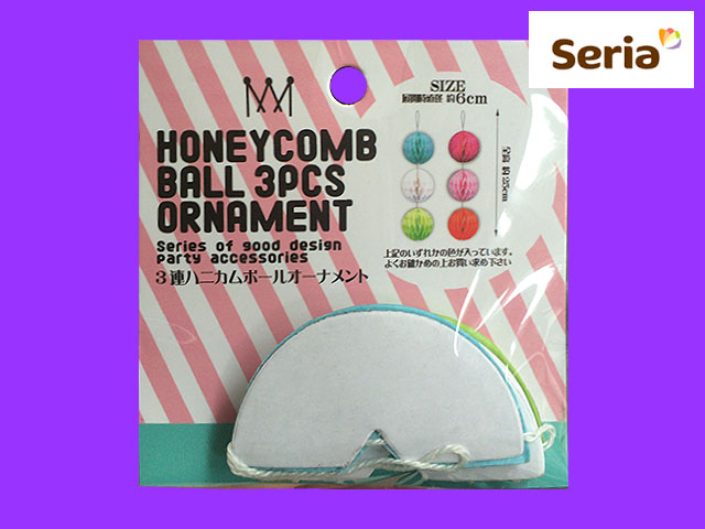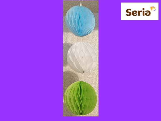 ■セリア 紙製のデコレーショングッズ。 開いて留めると直径6cmほどのボールが3個つながった全長25cmほどのオーナメントになる。 画像の「青・白・緑」の他、「赤・桃・橙」の組み合わせの物もある。