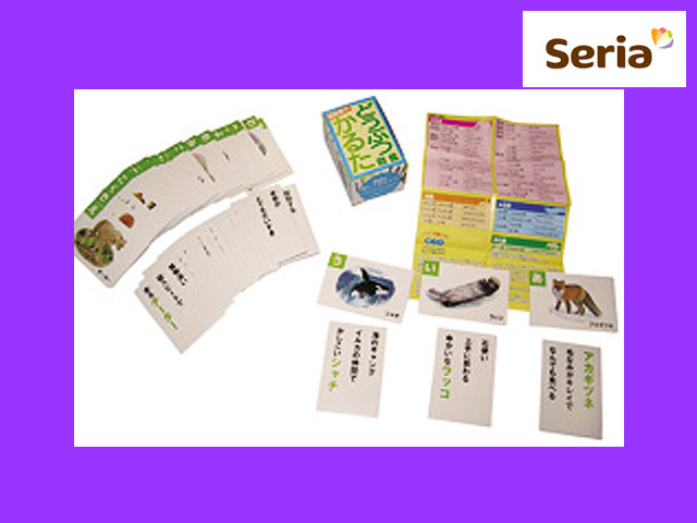 セリア(2016〜) 47種類の動物かるた。 封入の分類表で、分類、体長、分布なども確認できる。 取り札47枚、読み札47枚、白札6枚、分類表付 サイズ:7.8cm×5.5cm×4.6cm