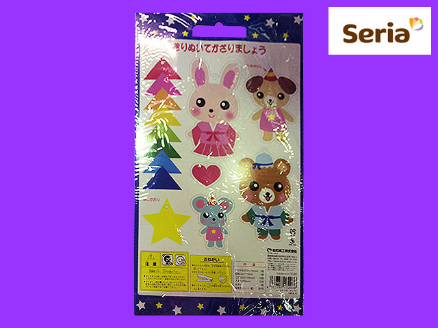 セリア 七夕飾りの各種セット。 おりがみ(115×115mm)5枚 たんざく(50×175mm)5枚 くさり( 25×150mm) 10枚 こより(210mm)    10本 丸ネット        1枚 型抜き(ハート・星) 各1枚 このほかに裏面にプリントされたキャラクタなども利用可能。