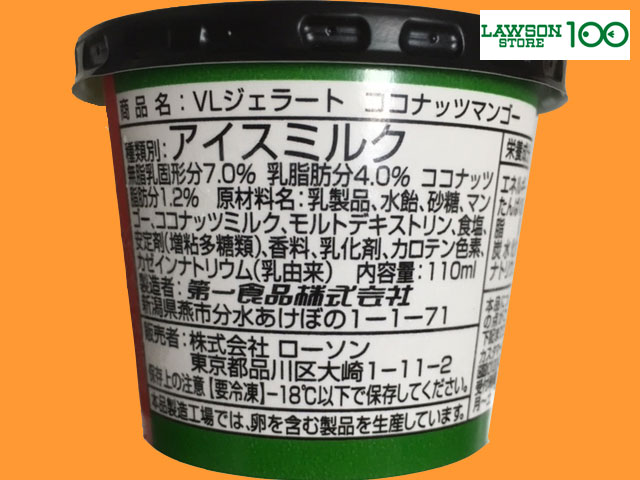 ■ローソンストア100 ジェラート。 内容量:110ml 123kcal [引用]マンゴーにココナッツを加えることで、夏に向けたトロピカルでさわやかな味わいに仕上げました。 ※ジェラートとアイスクリームのちがい 日本では『アイスクリーム』は、「乳固形分15%以上、その内8%が乳脂肪分」と定義されているため、このジェラートは表記のように『アイスミルク』に分類される。
