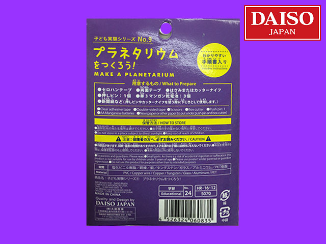 ダイソー(2016〜) 子ども実験シリーズから。No.9・プラネタリウムをつくろう! 古のギリシア時代、宇宙を表すものとされた正12面体を使ったピンホール投影機。 手順書に記載の星座をかたどるもよし、自由気ままに穴をあけるもよし。 いつもの天井が満天の夜空にかわる・・かも。 別途必要品:セロハンテープ・両面テープ・はさみ・押しピン・単三マンガン電池3個