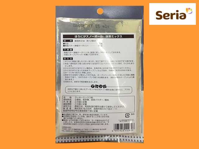 セリア セリアがシリーズ展開しているケーキミックス粉の新シリーズ。 直径約2cmのボール型クッキー 約12個分。 溶かしバターを混ぜ合わせて、寝かせた生地をコロコロ転がして成形する。 焼き上がり後にパウダーシュガーを降ったら、可愛らしいスノーボール型クッキーが出来る。 細かく砕いたアーモンドなどのナッツ類を混ぜるとアクセントになる。 調理所要時間は約25分。