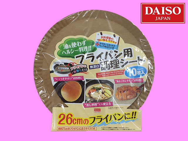 ダイソー フライパンの調理シート。シリコーンコート済みの高密度耐油紙製なので、油なしでもくっつかずに調理可能。 フライパンも汚さない。 サイズ:直径21cm 高さ1.7cm 10枚入り。 2023年現在、名称を「紙のフライパンシート」として発売中。 (中国製)