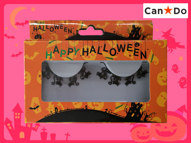 キャンドゥ キャンドゥオリジナル商品、ハロウィン用アイラッシュ ①蜘蛛の巣 ②猫 クモの巣つけまは、他にダイソー・クモの巣があるが、クモ本体はいない。 接着グルーは同梱されていないので別途必要(同様シリーズ共通) (中国製)