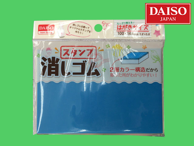 ■ダイソー 版画でスタンプを作るためのハガキ大消しゴム。 掘った所が分かるように二層構造になっている。 (中国製)