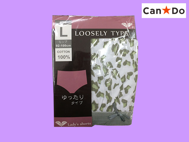 ■キャンドゥ 女性用綿100%のゆったりタイプショーツ。 通常よりゆったりめで股上が深くおなかまですっぽりカバーできるタイプ。 柄は数種類ある。 他に、サニタリー用もある。 サイズM:ヒップ87cm~95cm サイズL:ヒップ92cm~100cm (中国製)