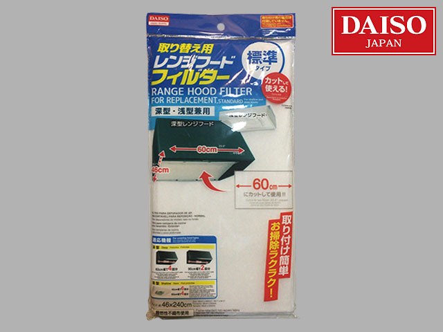 ダイソー レンジフードの取り替え用フィルター。 深型・浅型兼用。 46cm×240cm ご家庭のフードに合わせて自由にカットして使える。 深型60cm幅で4回分 深型90cm幅で2回分 浅型40cm幅で6回分 浅型60cm幅で4回分 設置用の磁石や両面テープは付属していない。 同シリーズで、磁石付属、両面テープ付属のものもある(ただし全長は短い)。
