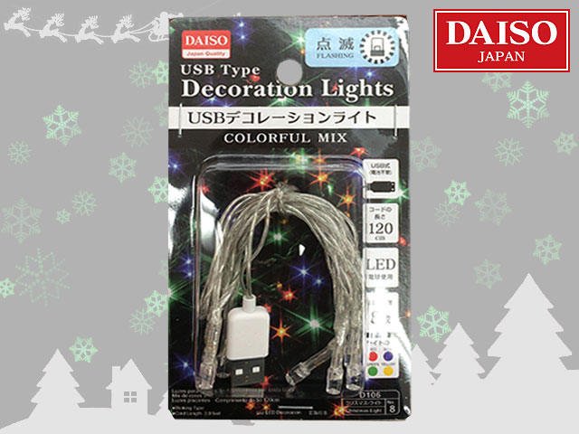 ■ダイソー(2016〜) USB式のLEDデコレーションライト。 4色ミックス8球点滅型。 コード長は120cm。 USBポートのあるPCやACアダプタなどに接続すると点灯。 外すと消灯する。 デコレーションライトは、他にも常時点灯型、点滅型がある。