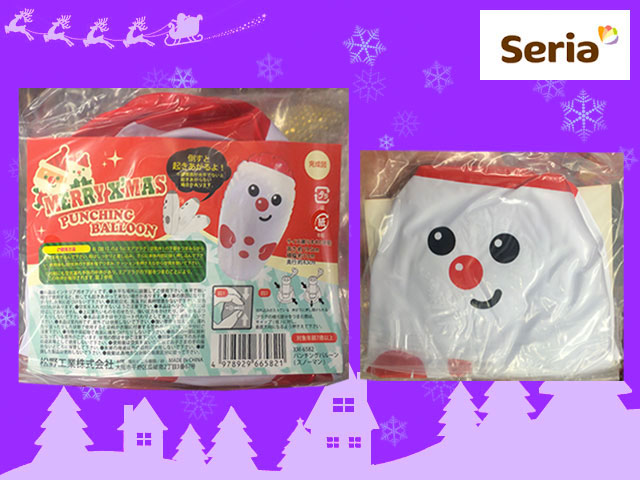セリア(2016〜) 膨らませると高さ20cmほどになる、倒すと起き上がる空気玩具。 ストレス解消用というより、インテリアオブジェとして。 ①サンタ ②スノーマン の2種類。 サイズ:H19.5cm×W11cm 発売元:松野工業株式会社 (中国製)