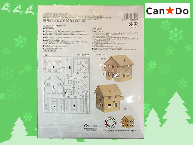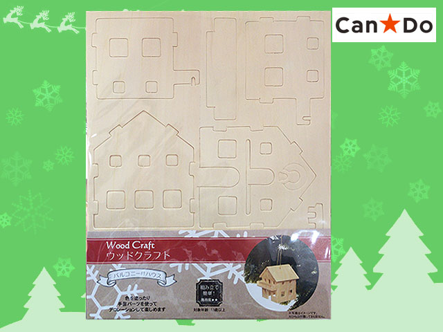 ■キャンドゥ(2016〜) ウッドクラフト。クリスマスシリーズから バルコニー付ハウス。 屋根部分に吊り下げ用の穴があるので、ツリーのオーナメントとしても使える。 (ひもは付属していないのでお好みのものを) 本体サイズ 23×18.5 紙やすり1枚付き 組立難易度 ★★☆