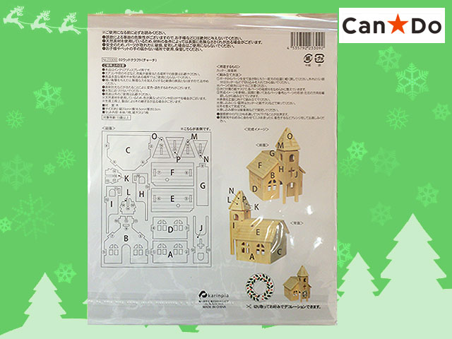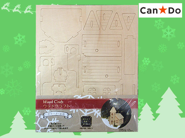■キャンドゥ(2016〜) ウッドクラフト。クリスマスシリーズから チャーチ・煙突。 屋根部分に吊り下げ用の穴があるので、ツリーのオーナメントとしても使える。 (※紐は付属していない) 本体サイズ 23×18.5 紙やすり1枚付き 組立難易度 ★★