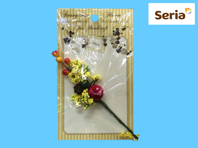 ■セリア(2015〜) セリアは、フラワーアレンジメント用のピックを多数そろえている。 すでにアレンジメントされているので、手を加えなくても、単独としてのインテリア小物として向いている。