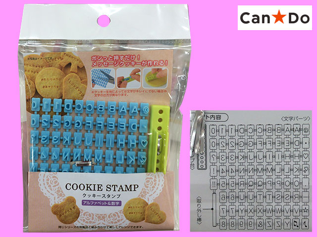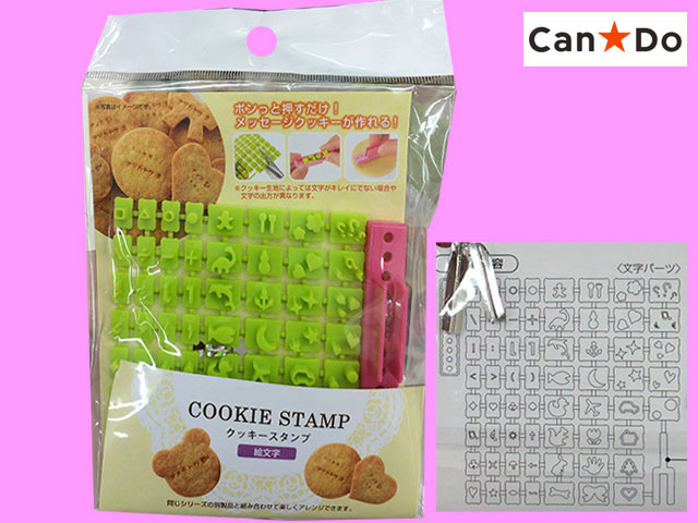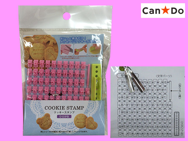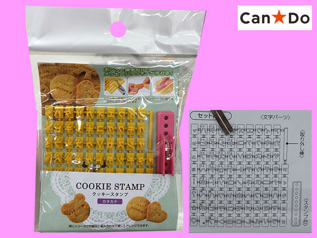 ■キャンドゥ 手作りメッセージクッキーが作れるスタンプ。 10文字までセットできるスタンプ台と、濁点、半濁点を含む85の文字パーツのセット。 カタカナ、アルファベット、絵文字セットがある。 他のセットと組み合わせてアレンジ可能。