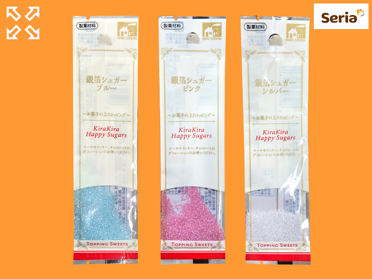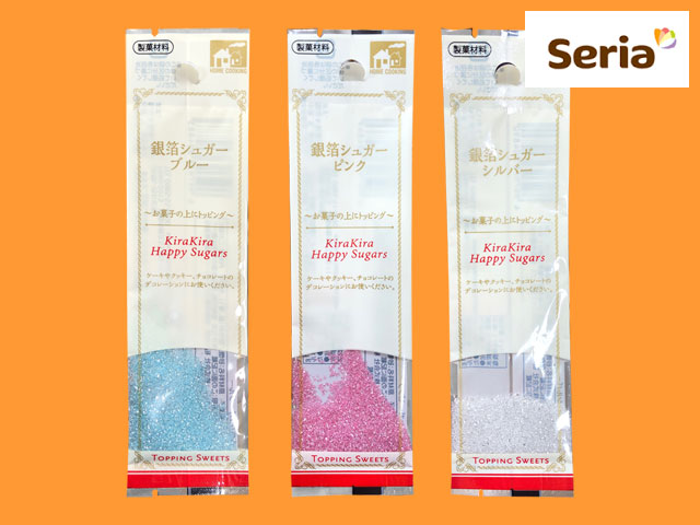 ■セリア(2020年パッケージ変更) クッキー、ケーキ、チョコレートなどのトッピング用砂糖。 ・銀箔シュガーピンク ・銀箔シュガーシルバー ・銀箔シュガーブルー 内容量:1g (日本製)