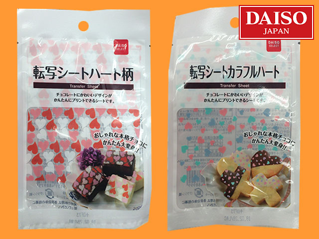 ダイソー(2017〜) 溶けている状態のコーティング用チョコにプリントできる転写シート。 転写した後は、もちろんそのまま食べられる。 (ベルギー原産) ・ミュージックノウト ・キューティーフラワー ・ハート柄 ・カラフルハート