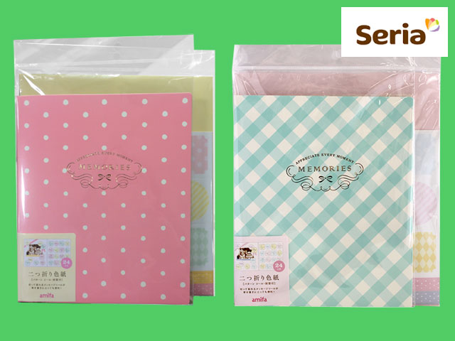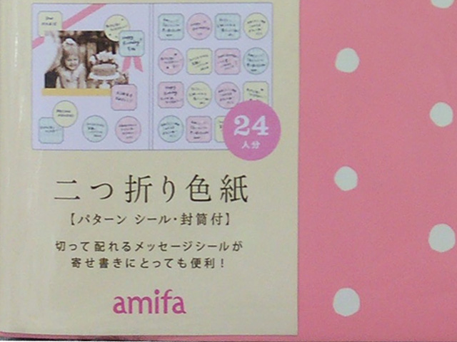 ■セリアほか(2016〜) amifa製の二つ折り色紙。2種類。 寄せ書き用のパターンシール24人分と、封筒が付いている。 開いた時のサイズ:横36.1cm × 縦21cm ☞他の色紙一覧を見る