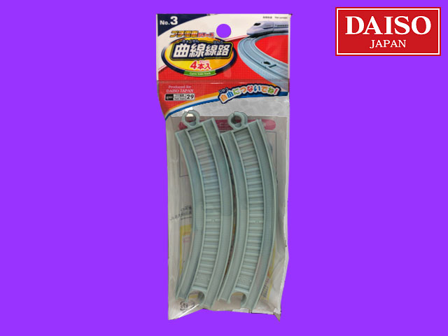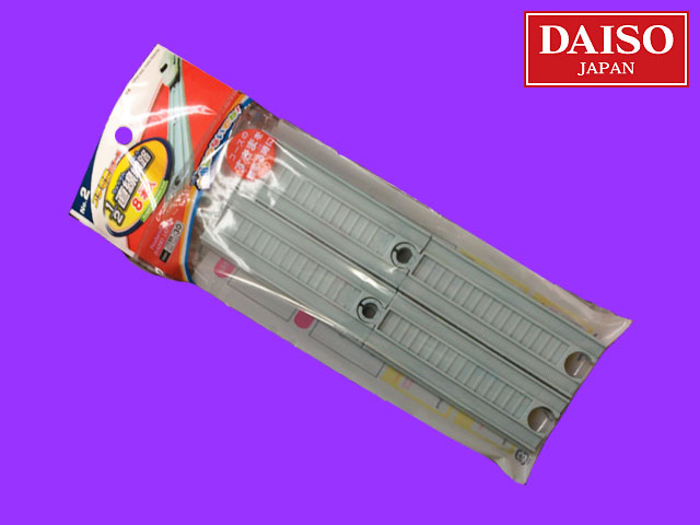 ■ダイソー プチ電車シリーズの線路。 ①基本になる直線線路。通常タイプ4本入り ②直線線路1/2タイプ8本入り ③曲線線路4本入り。 8本で円形コースができる ④坂レール4本入り。 スロープ付きの線路。2本でちょうど直線レール1本分の長さ ⑤ストップ線路2本入り。 レバーを上げると電車が止まる (中国製)