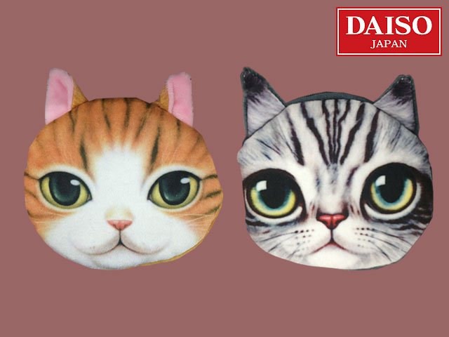 ダイソー ネコ顔プリントのファスナーポーチ。 ボールチェーン付属。 他にドッグもある。 サイズ:約11cm × 12cm (中国製)