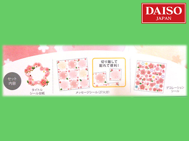 ■ダイソー(2017〜) 桜模様のシールキット。 ・一枚毎に切り離せるメッセージシール27枚。 ・中央を飾るのにぴったりなタイトルシール台紙1枚。 ・桜のデコレーションシール。 上記の3点セット。 ☞他の桜シリーズを見る