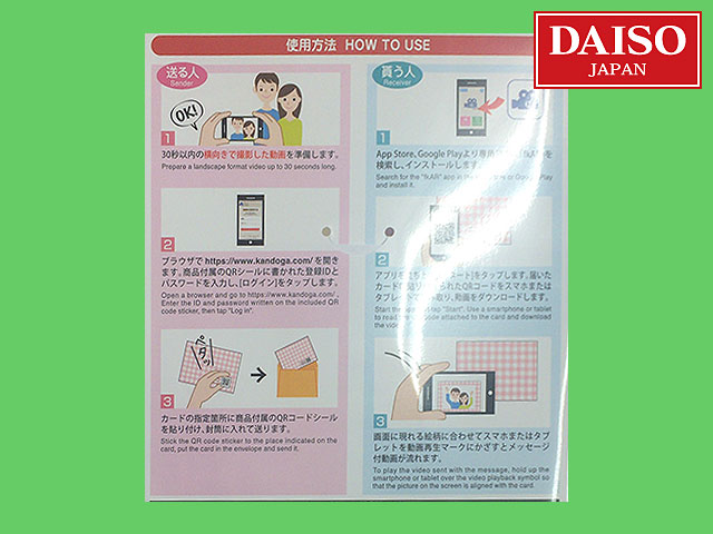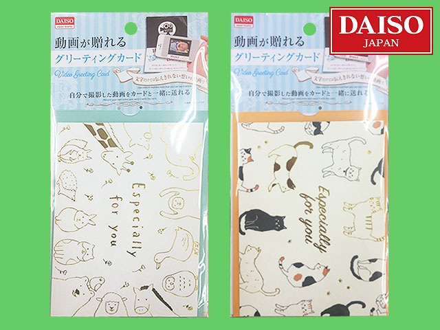 ■ダイソー(2017〜) 撮影した動画をメッセージと一緒に贈れるカード。 (専用サイトと専用アプリが必要) 文字だけでは伝えきれない想いに♪ ・クラシック ・チロリアン ・アニマル①②