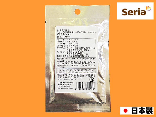 ■セリア(2017〜) セリアがシリーズ展開している製菓用の材料。 九州産紫芋を100%原料とした、乾燥野菜粉末。 主材料の粉に対して、5%~10%混ぜるのが目安。 風味豊かで焼き菓子やパン生地にぴったり。 彩りも華やかな仕上がりになる。 内容量:8g (日本製)