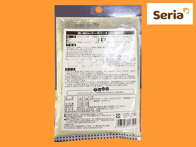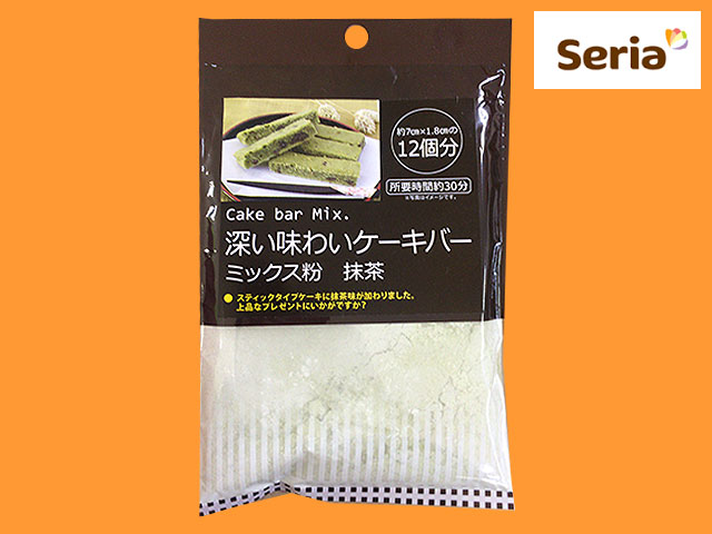 セリア セリアがシリーズ展開しているケーキミックス粉。」 新シリーズのケーキバー、抹茶味。 11×14cm角の焼き型一枚分。 他材料:卵一個 無塩バター30g 牛乳大さじ1 つぶあん30g(入れなくても作れる) 焼き型一枚が焼きあがったら、7cm×1.8cmに12等分にカット。 スティック式のケーキになる。 ワックスペーパーなどにつつんで、片手で簡単に食べられるお菓子に。 ホワイトチョコチップとの相性もバツグン。 70g入り 調理所要時間は約30分。