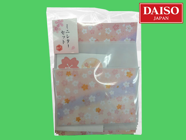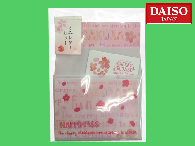 ■ダイソー(2017〜) ダイソーの2017年『桜シリーズ』のミニレターセット。 便せん×12枚、封筒×6枚、シール×1枚のセット ①伝統さくら ②おぼろ小桜 ③チェリーブロッサム 便せんサイズ:8.5cm × 12cm 封筒サイズ :9cm × 6cm シールサイズ:5.3cm × 8.5cm (中国製)