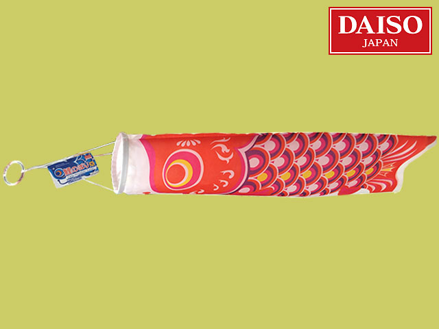 ダイソー(2017〜) ポリエステル製鯉のぼり。 黒、青、赤、緑の4種類。プラスチック製マルカン付属。 年々大きくなっていて、2014年現在で、長さ84cm×幅19.5cm (中国製)