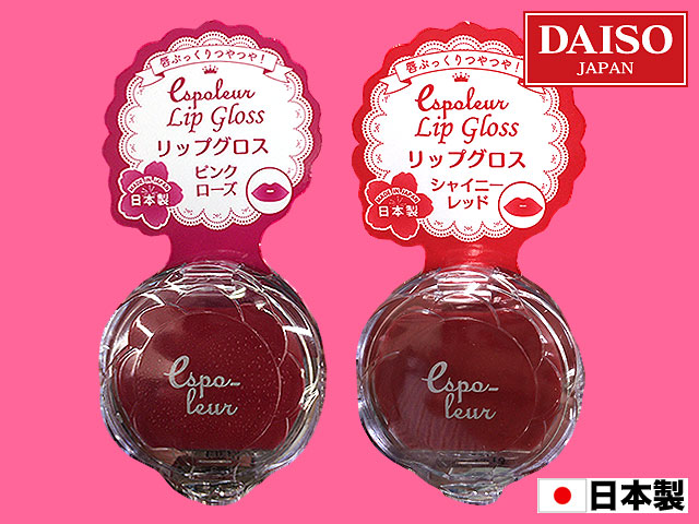 ダイソー ダイソーのネイルポリッシュでお馴染み『エスポルール』シリーズから。 ケースタイプのリップグロス。 ・ハチミツ・水溶性コラーゲン・ツボクサ葉エキス・シアバター・ライスワックスの5つの美容液成分配合。 全5色 左から、 ①クリアシャイン ②ジューシーオレンジ ③ジューシーピンク ④ピンクローズ ⑤シャイニーレッド 同じカラーバリエーションでチューブタイプもある。 (日本製)