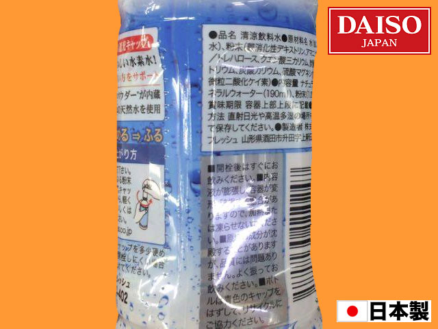 ■ダイソー 山形県鳥海山の水を元に造られた水素水。 特殊な形状のキャップで、鮮度が落ちないようになっている。 内容量:190ml (日本製)