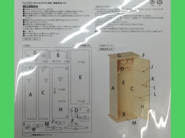 キャンドゥ ウッドクラフトの『学校シリーズ』から。 掃除用具入れ。 本体サイズ 28.5cm×18.5cm  紙やすり1枚付き 組立難易度 ★ (中国製)