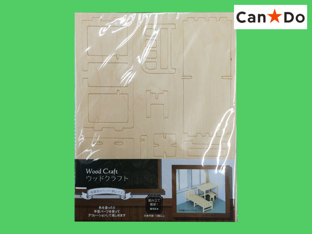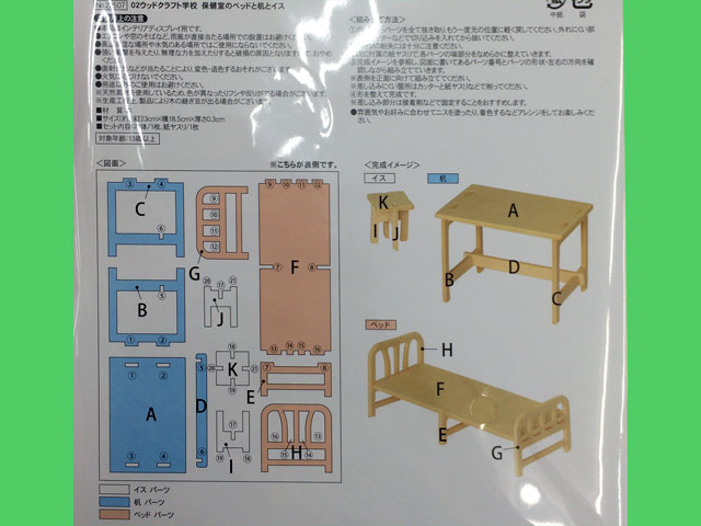 キャンドゥ ウッドクラフトの『学校シリーズ』から。 医務室のベッドと机と椅子のセット 本体サイズ:28.5cm×18.5cm  紙やすり1枚付き 組立難易度 ★ (中国製)