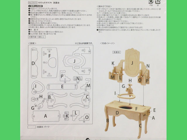 ■キャンドゥ ウッドクラフト。ヨーロピアンシリーズから 洗面台。 一枚の板から各部品を抜き取って組み立てていく工作品。 某有名ミニチュア玩具の○○ファミリーシリーズにもぴったりと、ファンが多い。 本体サイズ 28.5×18.5 紙やすり1枚付き 組立難易度 ★ ※在庫限りで販売終了なので、欲しい方はお早めに。 (中国製)