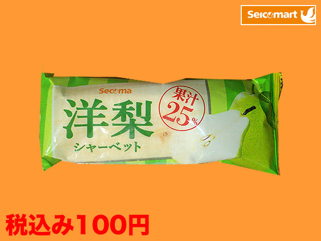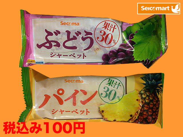 ■セイコーマート セイコーマートオリジナル商品。 果汁を使ったシャーベットシリーズ。 税込み100円。 白桃 国産果汁使用 果汁果肉30% ゆず 国産果汁使用 果汁5% ぶどう 果汁30% パイン 果汁30% 洋梨 果汁25% ※セイコーマートは、北海道を中心に展開されているコンビニチェーン。 顧客満足度で、セブンイレブンを抜いた。