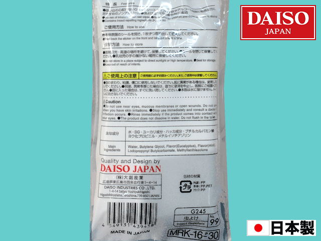 ダイソー(2017〜) 虫よけのユーカリ成分を含むクールシート。10枚入り。 (日本製)
