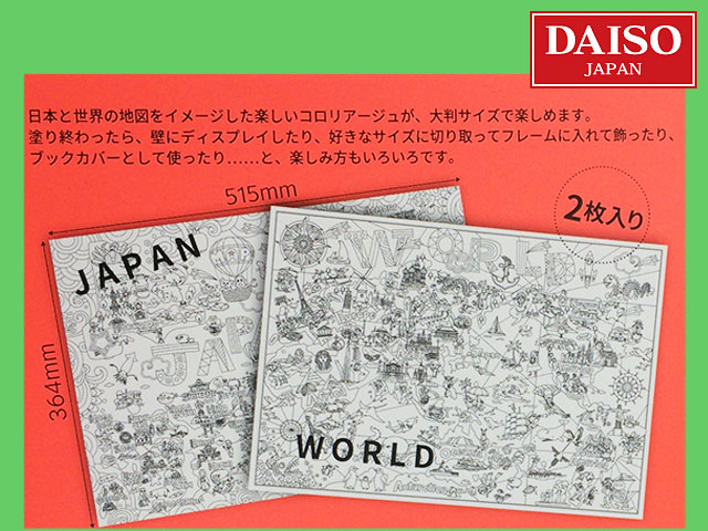 ■ダイソー(2017〜) B3(36.4cm×51.5cm)の大判サイズな一枚ものの塗り絵。 日本と世界の地図をイメージしたイラスト。 塗り終わった後にディスプレイやブックカバーとしても使える。 コロリアージュ(仏語で塗り絵)は、アンチストレス対策としてセラピーに取り入れられている。 イラスト:エダりつこ