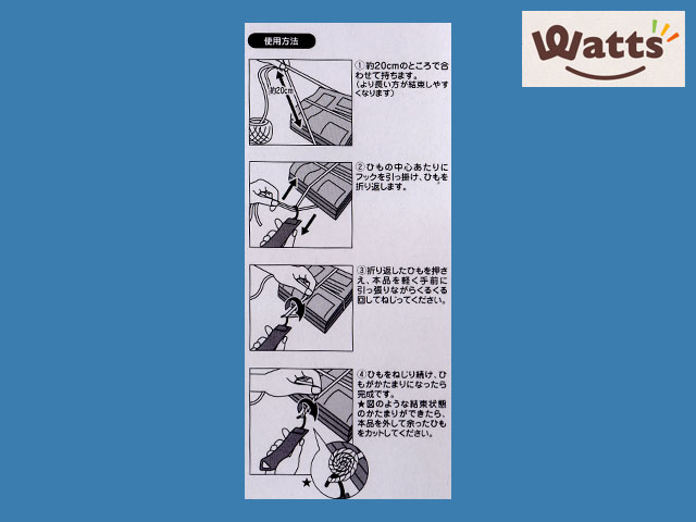 ワッツほか(セリアでも販売を確認) 古新聞や段ボールなどを簡単に結ぶ道具。 束ねた古新聞等にかかった紐を本体フックにひっかけてクルクル回すだけでキッチリと結束できる。 手で結ぶより力が要らず簡単に結べる。 サイズ:16.5cm×4cm×1.6cm 発売元:ウォーターライトGE株式会社 (中国製)