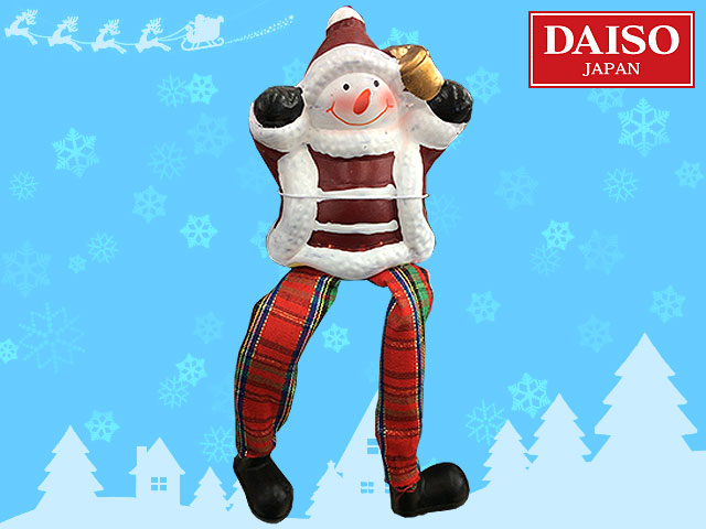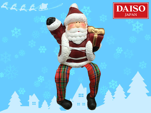 ダイソー(2017) セラミック製クリスマス置物。 ブーツを除く脚部分がポリエステル製布なので、座り姿で飾ると足がぶらぶらと動く。 全長約15cmほど。 (中国製)
