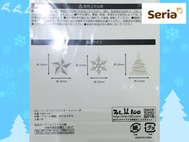 ■セリアほか(2017~) アクリル製のツリー用オーナメント。3個入り。 約3cm × 3cm 一般人のアイデアから生まれた「みん100」商品。 パッケージが、なぜか当図鑑の背景と似ている・・・のは気のせい? (中国製)