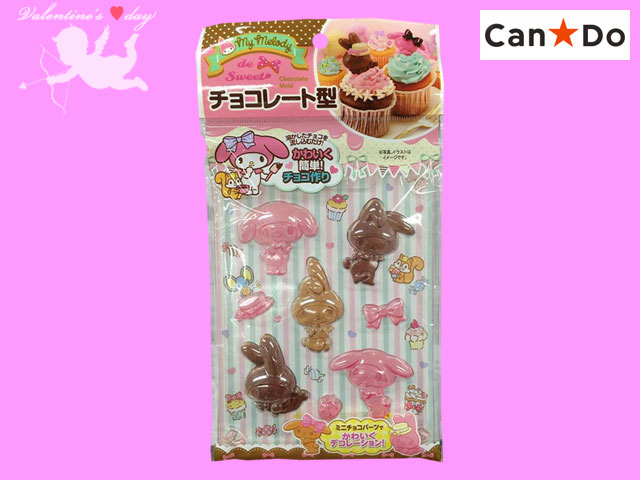 キャンドゥほか(2018〜) サンリオのポリエステル製チョコモールド『マイメロディ』。 チョコレートペンがセットになっている。 他に『ハローキティ』、スティックバージョンがある。 サイズ:12cm × 16cm 深さ0.9cm (中国製)