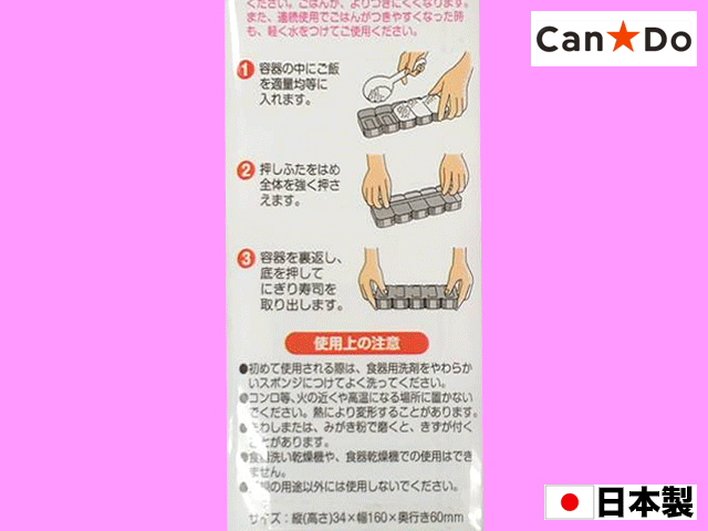 ■キャンドゥほか にぎり寿司のシャリを、一度に5個つくれる型。 ご飯がくっつきにくいエンボス加工が施されている。 サイズ:16cm × 6cm × 高さ3.4cm (日本製)