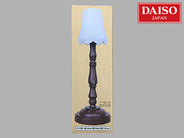■ダイソー(2017〜) アンティーク調のシェード付きライト。 本体カラーは、茶色、白色、黒色の3色。 ライトの色は電球色 光束7.2LM ボタン電池LR44×3個使用 連続使用目安時間:約2.5~3時間 本体サイズ:縦5.9×横5.9×高さ18.3cm ボタン電池3個付属。