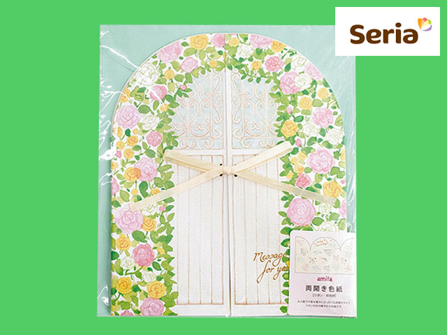 ■ワッツほか、セリア、キャンドゥでも発売(2017〜) amifa製、封筒、サテンリボン付の両開きタイプの色紙。 サイズ:見開き時:24cm × 41cm (中国製)