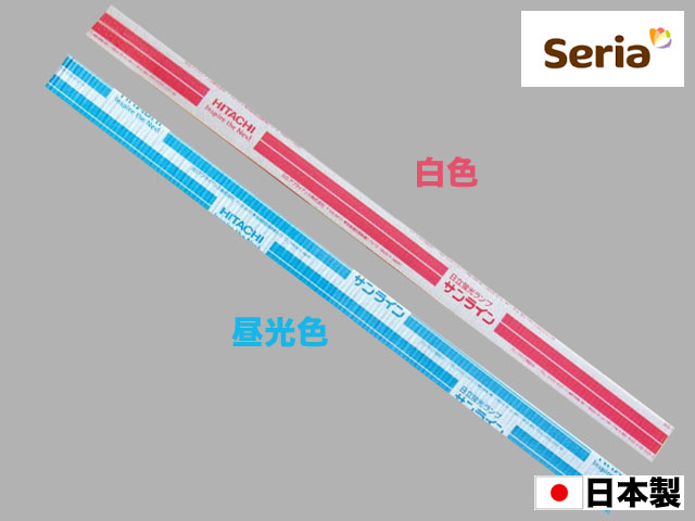 セリア/日立15W蛍光灯昼光色15W蛍光灯は日立、パナソニック、NEC、三菱、どれも100円前後が相場みたいなので、セリアで100円+消費税で買って得か損かは近隣での販売価格次第でしょうね。15W蛍光灯(直管)は安いですが、60W白熱電球相当の15W電球型蛍光灯と比べると寿命がとても短いです。賃貸のキッチンが15W蛍光灯(直管)なので仕方なく何度も買い換えて使ってます。蛇足ですが、古い賃貸にお住みの方は浴室などの密閉型照明の中を確認することをお勧めします。私は8年住んで初めて浴室の照明が切れたのですが、中を開けたら100Wの白熱電球が使われていました。入居時に確認して100W相当の電球型蛍光灯や電球型LEDに取り替えていたならばかなり電気代が節約できたのにと後悔しました… 今や100W相当の電球型LEDは価格も安く5年保証も付いているので1年ちょっとで元が取れてしまいます。
