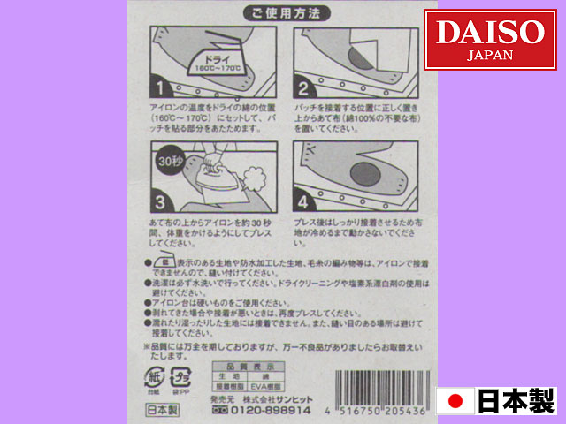 ダイソー 肘、膝部分の破れ補修用の布。アイロンで接着する。 2枚入りで、サイズは10.5cm × 7.4cm(実測) 他にベージュ地の物もある。 (日本製)