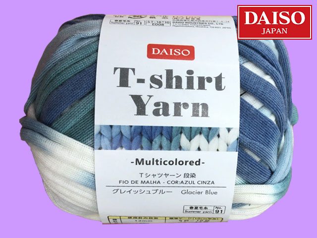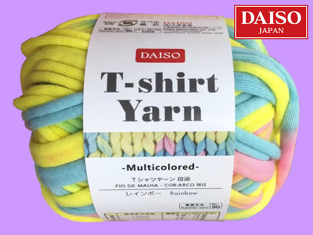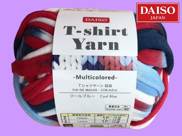 ■ダイソー(2018〜) この種の商品としては、異例のヒットとなったダイソーのTシャツヤーンから、『段染』 #89 アプリコット #90 レインボー #91 グレイッシュブルー #92 クールブルー ポリエステル100%、約30g(糸長約9m) <編み針の目安> 12mm <標準ゲージ> 9目12段 10cm平方メリヤス編み