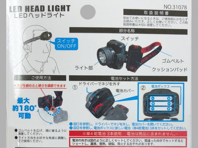 懐中電灯としても御薦め頭に付けるには、単四電池3本の仕様は、少々重たく垂れ下がる傾向